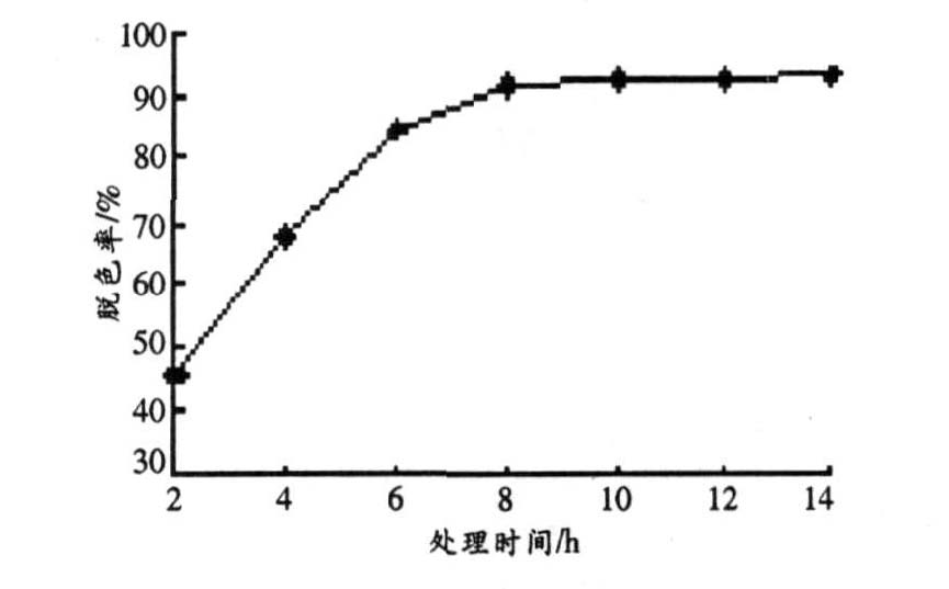 副產(chǎn)物鹽酸處理時間對海泡石和硅藻土混合物的吸附性能影響在溫度80℃條件下, 用 1. 2mol/L的工業(yè)副產(chǎn)物鹽酸處理海泡石和硅藻 土混合物, 就處理時間為: 2h、4 h、6 h、8 h、10 h、 12 h、14 h 時, 考察了混合物對廢水脫色率的效 果, 結(jié)果如圖2(實驗廢水取自印染廠調(diào)節(jié)池出 水, 其COD為800~ 850 mg /L, 色度為250~ 300, pH 約為6. 5~ 7)。